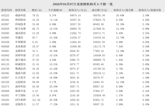 2026年04月07日盤后龍虎榜公開信息中,有45支股票出現了機構的身影。其中,有21支股票出現了機構買入,24支股票出現了機構賣出。